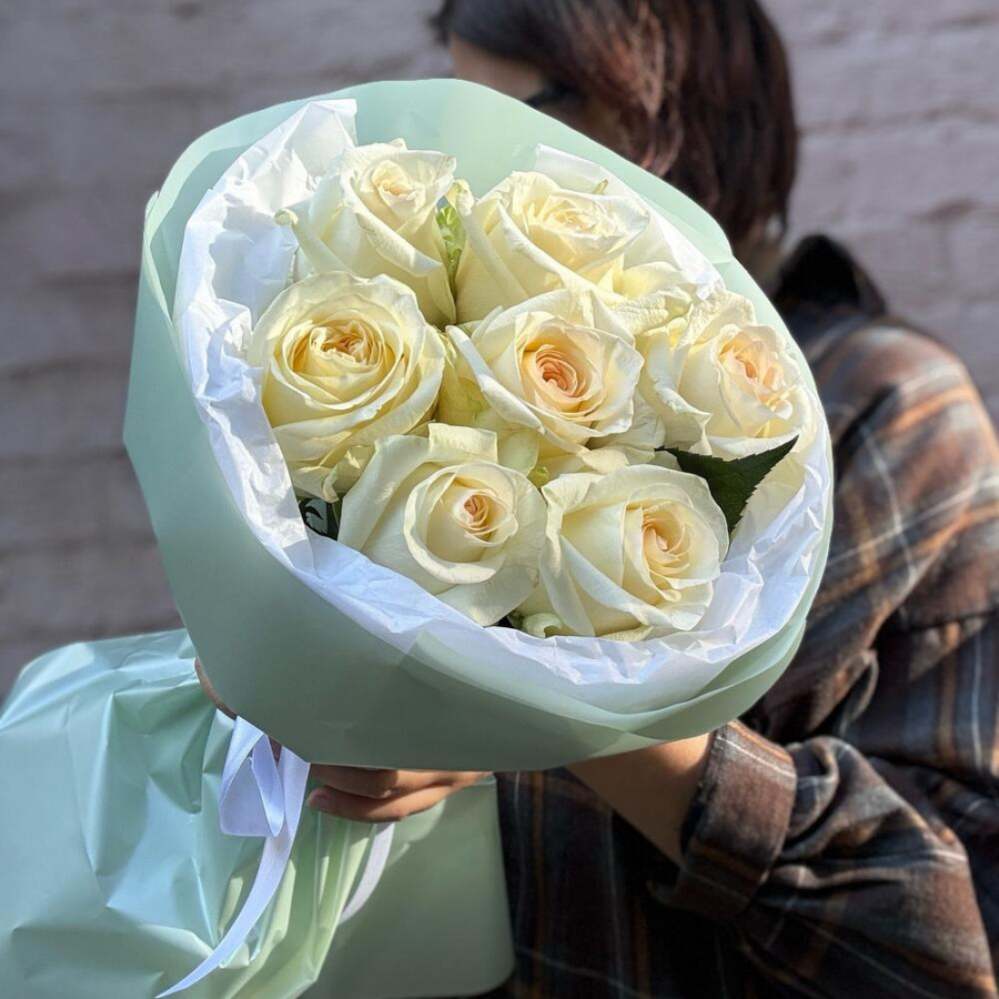 На фото 7 кремовых роз. В составе: роза 7 шт, дизайнерская упаковка 2 шт, атласная лента 1 шт, . Все цветы свежие и ароматные, букет красиво оформлен и отлично подходит для подарка. Доступна доставка цветов или самовывоз.