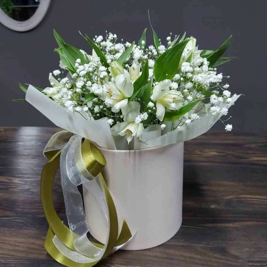 Белые альстромерии с гипсофилами в шляпной коробке в Сатке